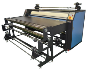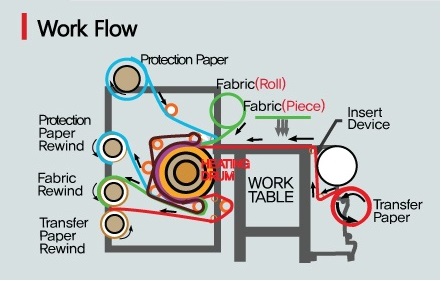 Presele termice rotative (calandre) se folosesc la transferul termic automat de sublimare atunci când hârtia imprimată și textilul sunt în rolă. De asemenea echipamentul este prevăzut și cu masă de lucru pentru a se putea sublima și bucăți de material. Masa de lucru ajută la poziționarea rapidă și ușoară a bucăților de material înainte de intrarea în zona de transfer. Tamburul este cu încălzire elecrică multi-zonă cu control riguros al temperaturii, pentru a asigura o uniformitate a temperaturii pe întreaga suprafață a tamburului. Este prevăzut cu un mecanism automat pentru reglarea tensiunii uniforme și constante pâslei de transfer, centrarea ei este de asemenea asigurată de un mecanism automat. Are un panou de control practic și ușor de utilizat. Este echipat cu mecanisme de preluare și înfășurare pentru material, hârtie și hârtia de protecție. Este soluția perfectă de finisare pentru multe aplicații de print pe textil cum ar fi imbrăcăminte, decor interior, echipamente sportive, reclame sau obiecte promoționale. Găsiți mai jos schița care reprezintă principiul de funcționare și tabelul cu specificații tehnice.